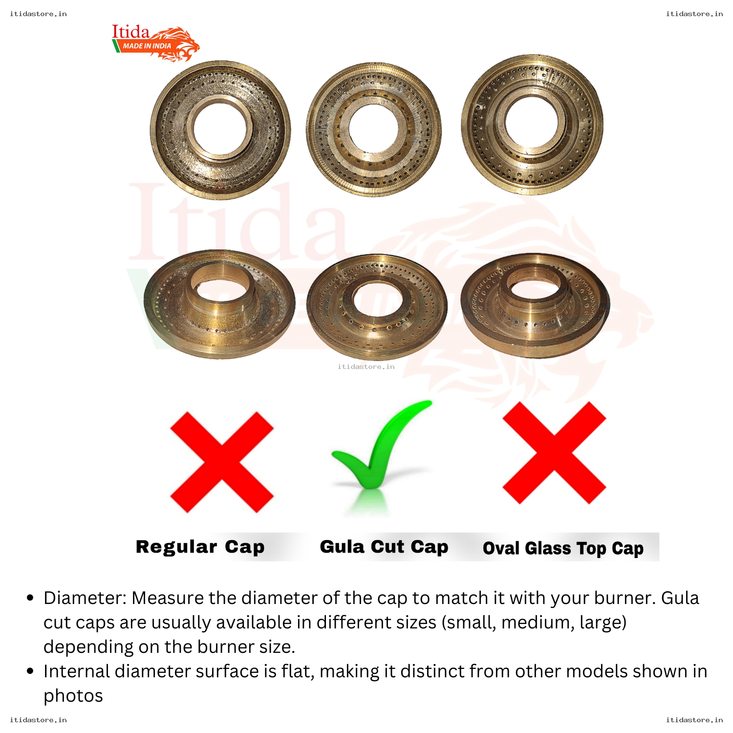 (Mazboot aur heat-resistant metal se bana hai jo tez garmi mein kharab nahi hota.) - ⚠️ CHECK PHOTOS CAREFULLY: “Gula Cut” caps have a specific shape. Please compare the design and size in the photos with your old caps before placing an order.