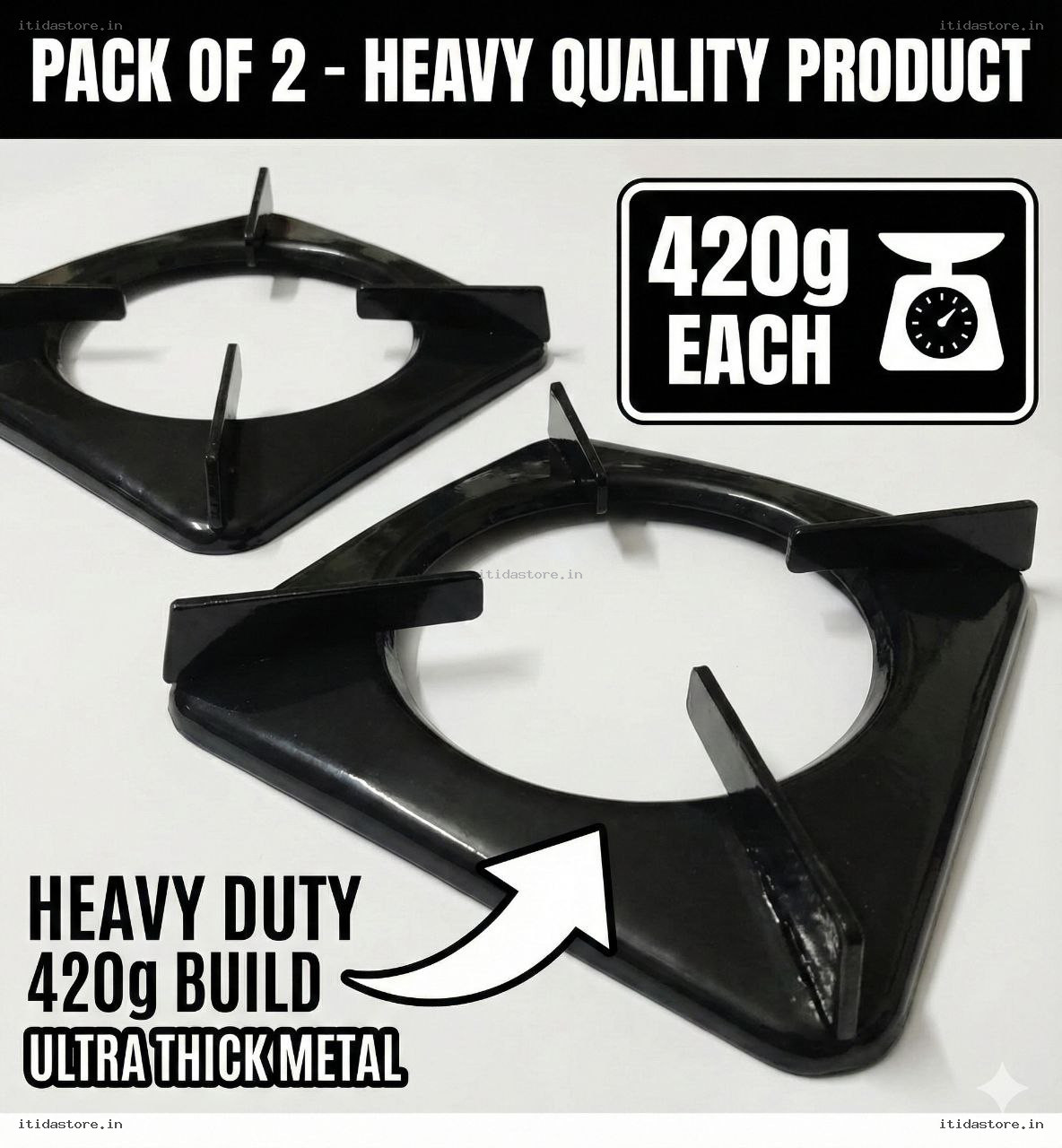 (Har stand ka wazan lagbhag 420 gram hai, jo ise standard supports se kahin zyada bhaari aur sthir banata hai.) - Wide Fit (21.5cm – 22cm): Designed for larger gas stoves requiring a pin-to-pin distance between 21.5 cm and 22 cm.